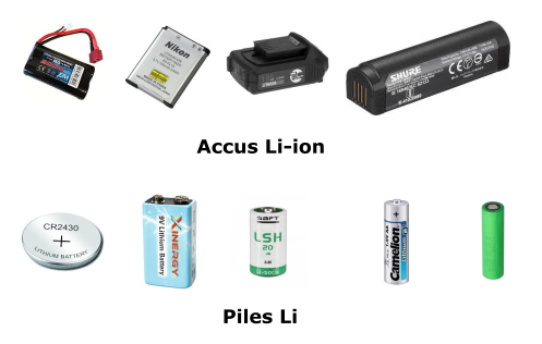 Les accumulateurs contenant du lithium se repèrent souvent à la mention non obligatoire « Li » ou « Li-Ion », symbole du métal lithium. Ces accumulateurs existent en diverses formes et tailles et ressemblent parfois à des piles ordinaires. Les accumulateurs rechargeables sont presque toujours des accumulateurs lithium-ion.